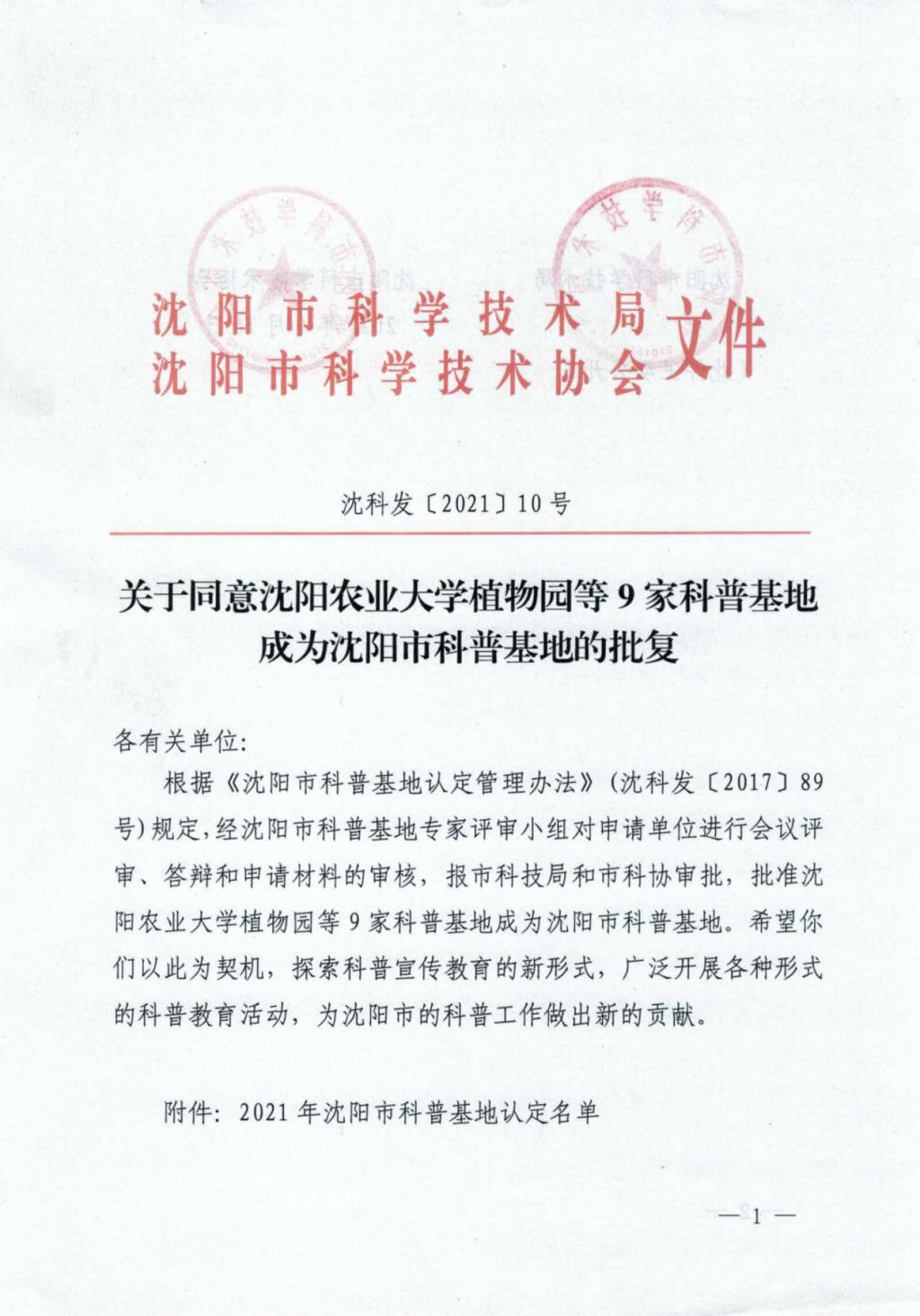 日前,沈阳市科学技术局、沈阳市科学技术委员会公布了“2021年沈阳市科普基地认定名单”。我院组织申报的“沈阳农业大学植物园科普基地”成功获批。