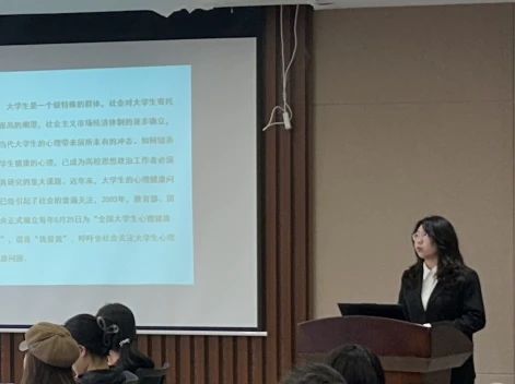 王宁同学从心晴使者与寝室长的作用和职能、如何辨识心理问题、如何采取干预措施、心晴使者可以开展的活动、校心理发展中心介绍及心理特色服务五个方面进行了精彩的讲解。