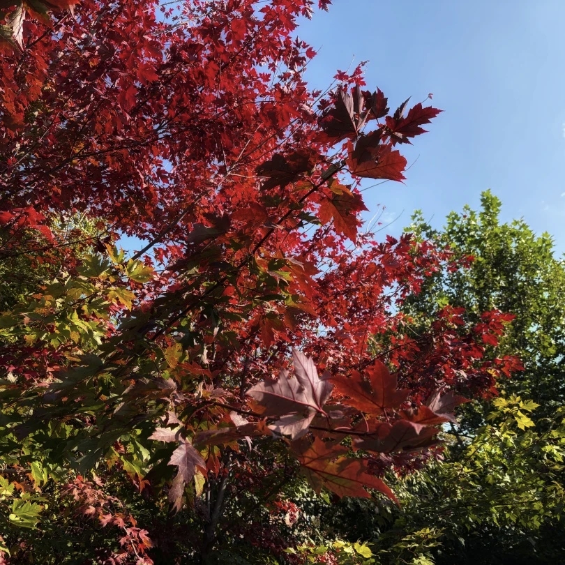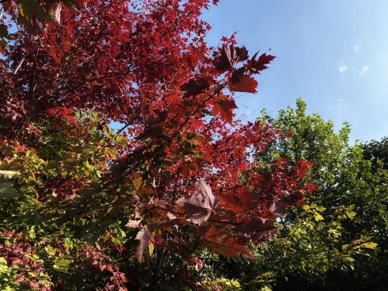 秋日悄然为我们的校园调色——红枫在湛蓝晴空的映衬下灼灼欲燃,银杏叶黄得透亮,似将整个秋天的光晖都收敛于纤细的叶脉之中。