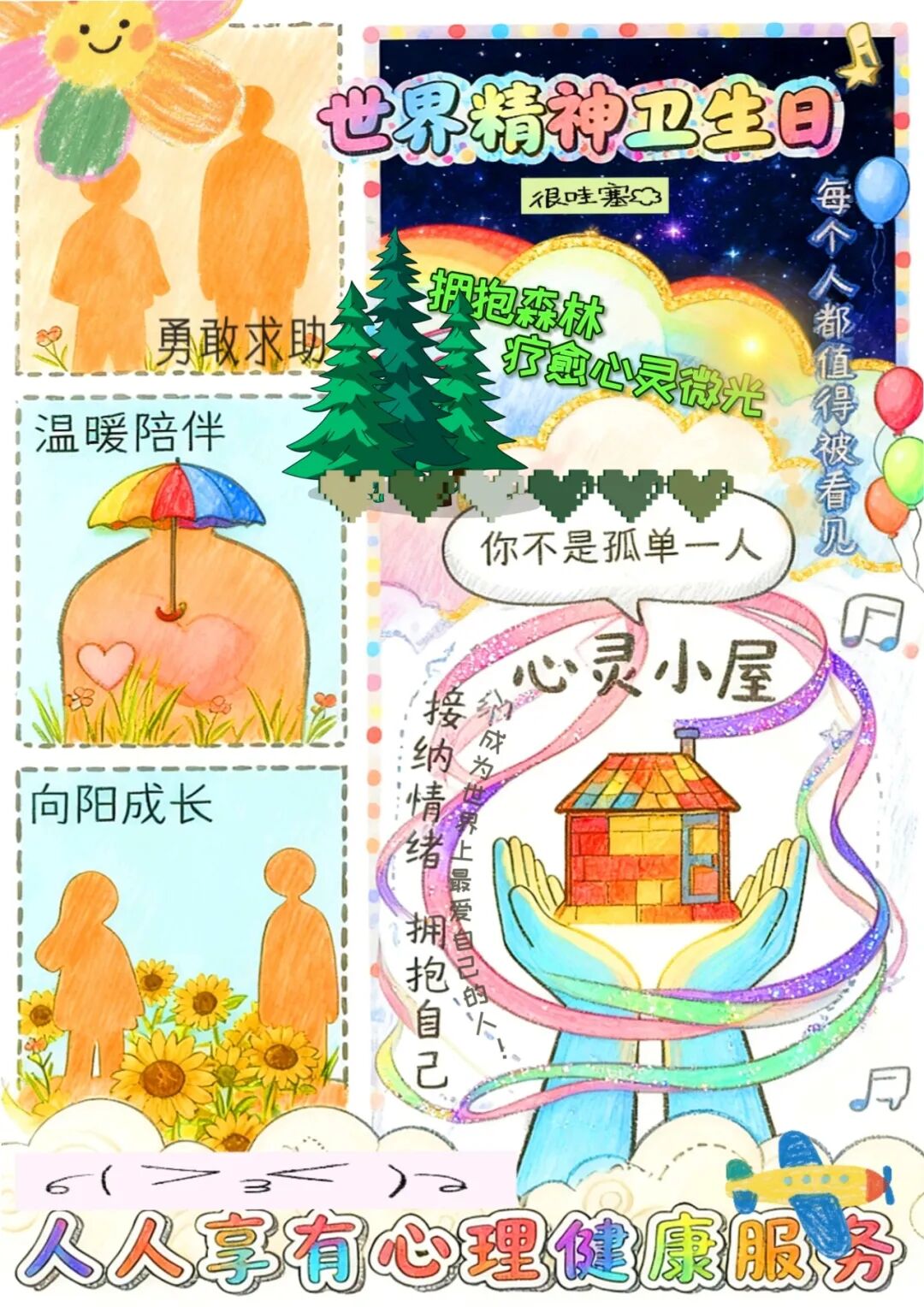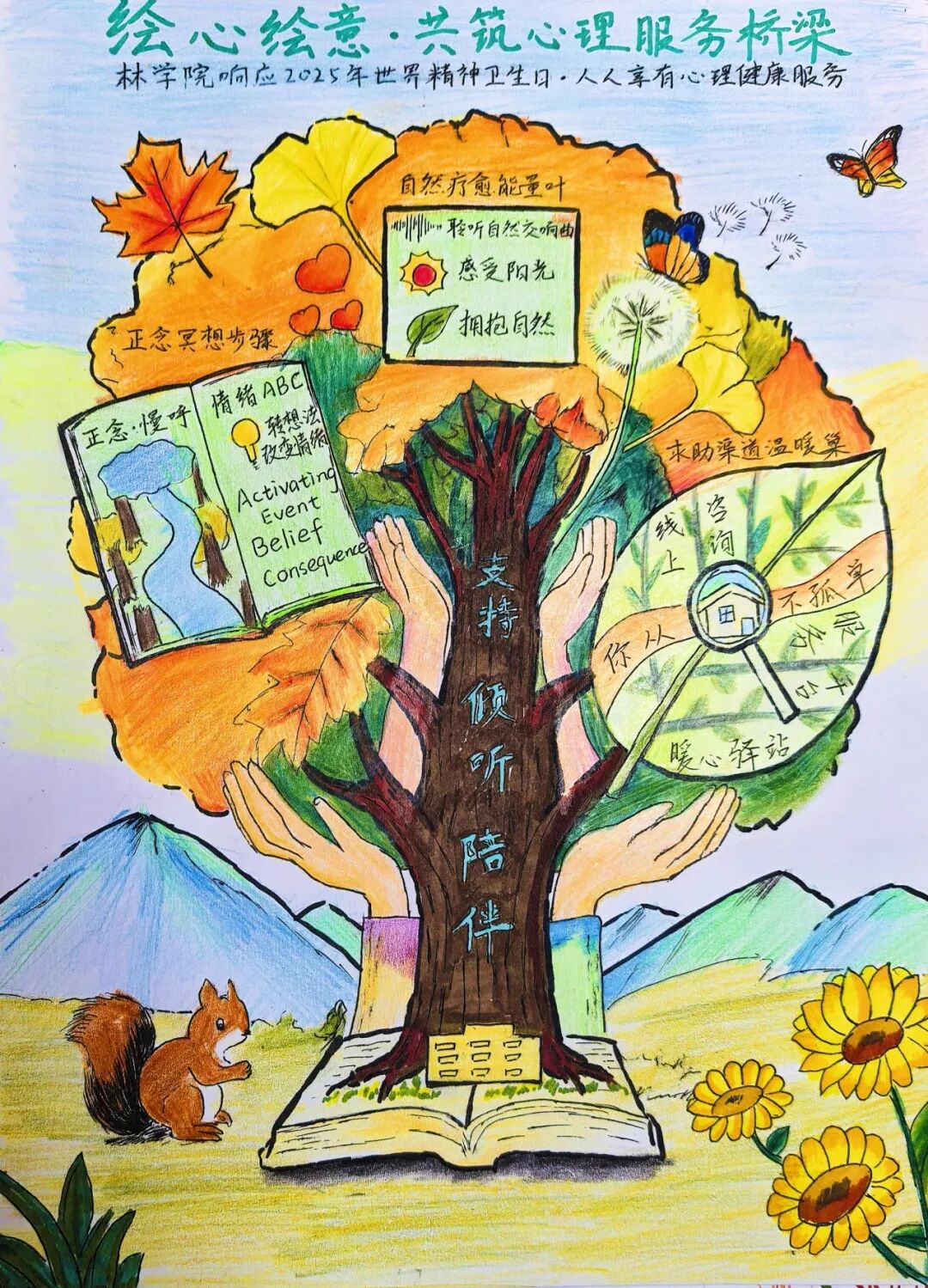 世界精神卫生日之际,林学院学子以笔为窗,绘出对心灵健康的关注。大赛期间,同学们用创意记录对“人人享有心理健康服务”的理解,每一幅海报,都是对心灵守护的热忱奔赴;每一抹色彩,都藏着传递心理能量的真挚期许。