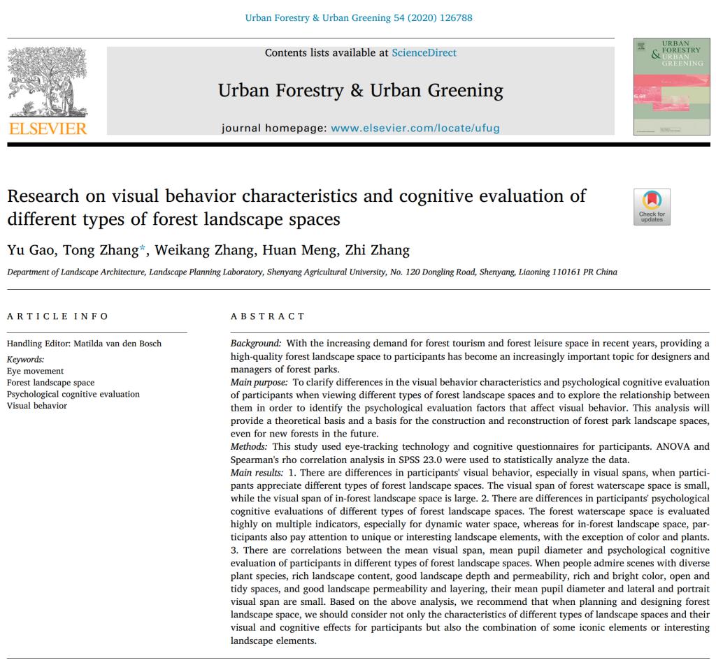 近日,国际著名期刊Urban Forestry & Urban Greening在线发表了我院风景园林规划设计团队地景规划研究室(Landscape Planning Laboratory)青年教师张桐博士为通讯作者的研究论文“Research on visual behavior characteristics and cognitive evaluation of different types of forest landscape spaces”。地景规划研究室教师张维康、孟焕、张智为共同作者,2018级风景园林硕士研究生高宇为第一作者。