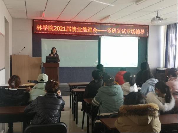 帮助2021届考研学生充分把握录取政策,提前做好复试和调剂相关准备,316中午学院在林学楼219举办2021届毕业生就业推进会本次活动邀请研究生院马晴晴老师担任主讲,林学院党委副书记杨宇老师林学院组织员、研究生招生负责人王青娜老师、辅导员姚远老师和王秋凝老师出席了本次活动2021届部分考研学子参加讲座。
