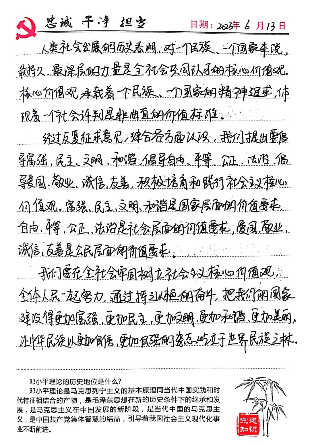 作为一名党员,要不断深化对社会主义核心价值观的认识,把学习社会主义核心价值观看作是一次精神洗礼,坚持不懈地用社会主义核心价值观来武装自己,在新的形势下始终牢记宗旨,高举旗帜,在工作岗位上不断攀登新的高度。