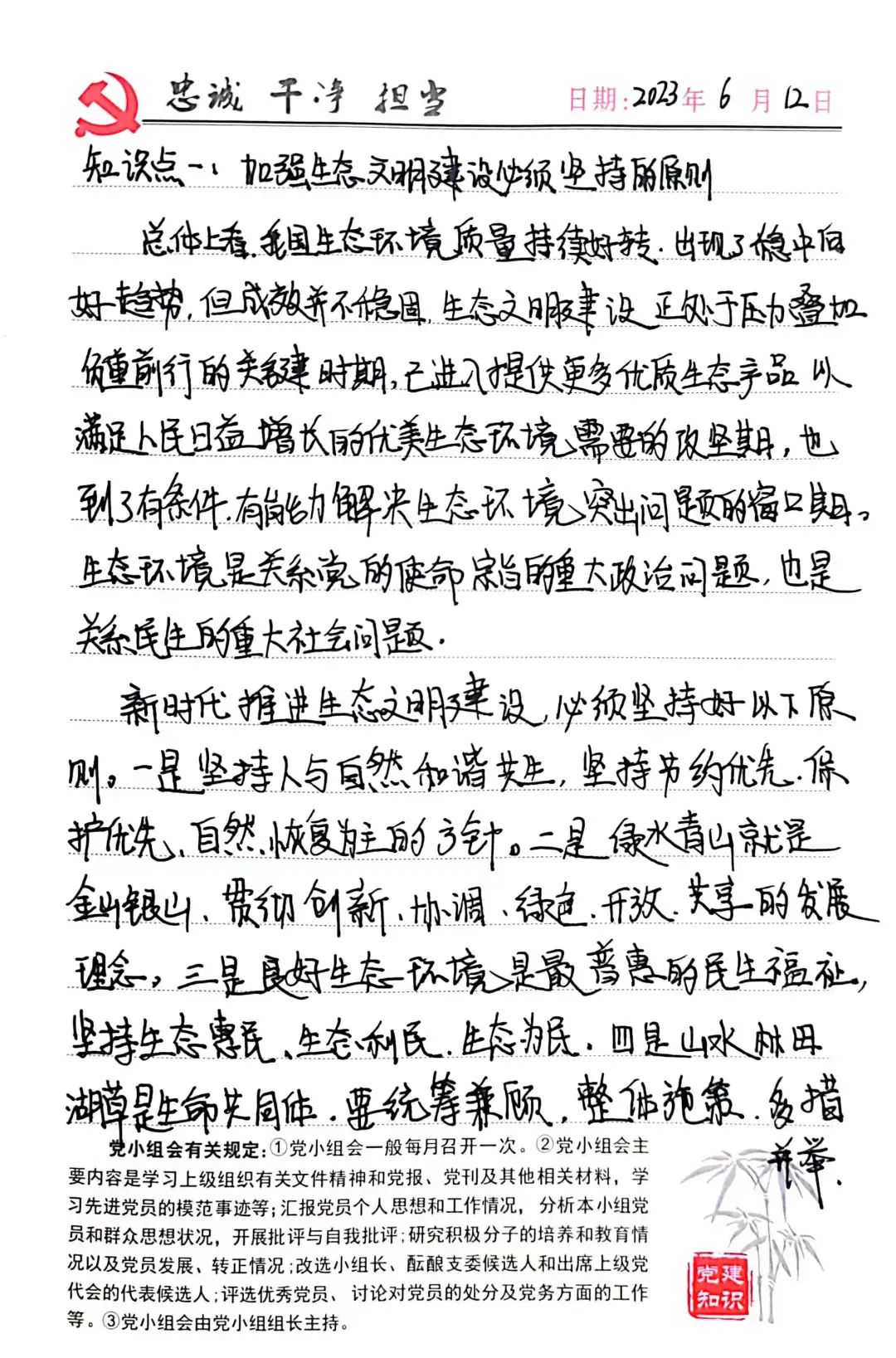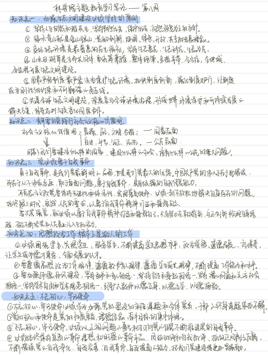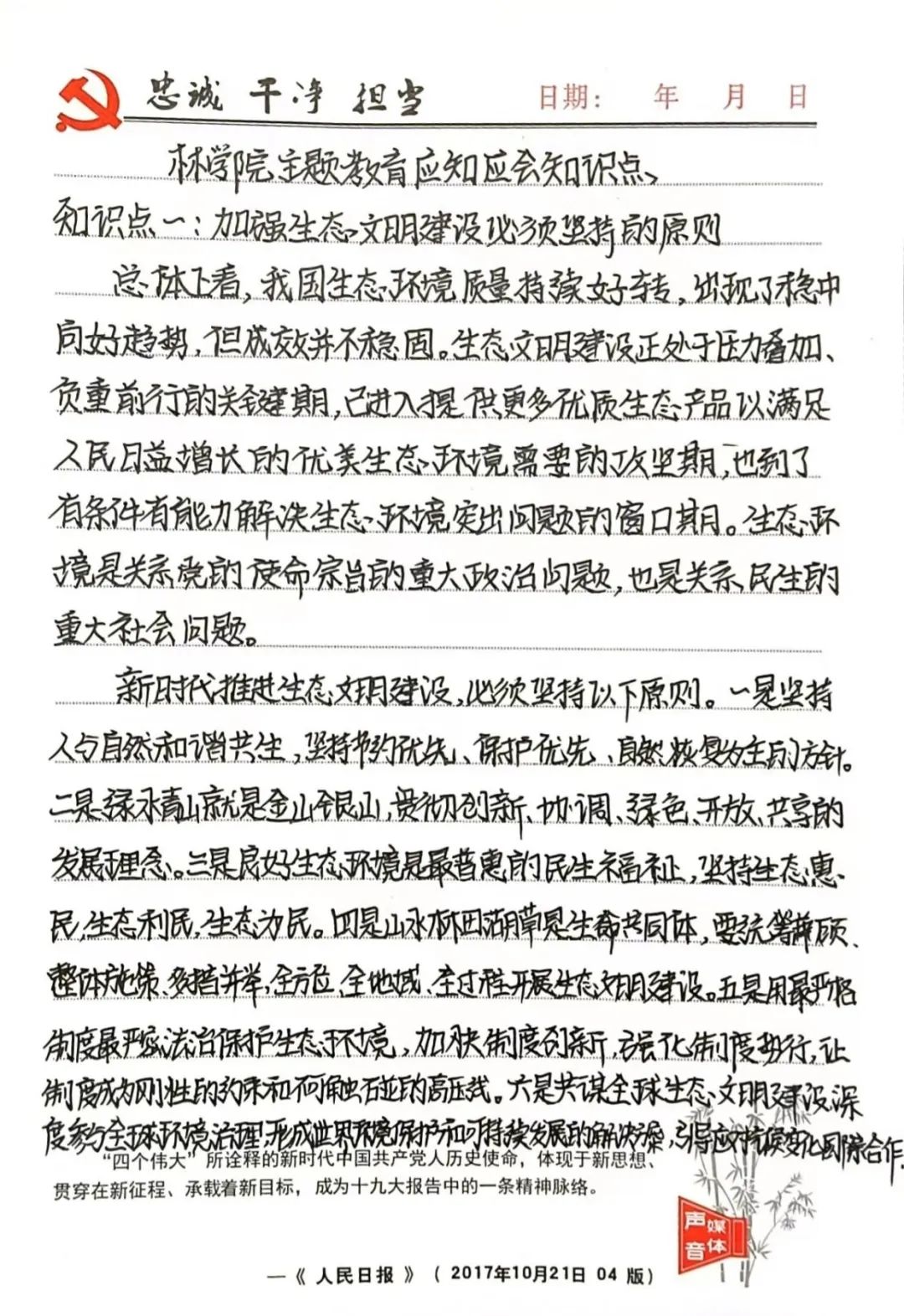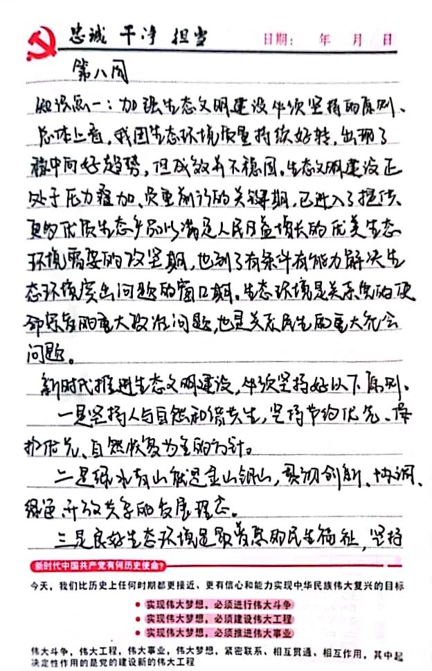 通过本次主题教育的学习,我对加强生态文明建设必须坚持的原则有了深刻的认识。保护绿水青山是我们的使命和责任,新时代推进生态文明建设,必须要坚持好相应的原则。作为一名林学专业的学生,我们要加强对专业知识的学习,将课堂上学习到的理论知识运用到实践中去。