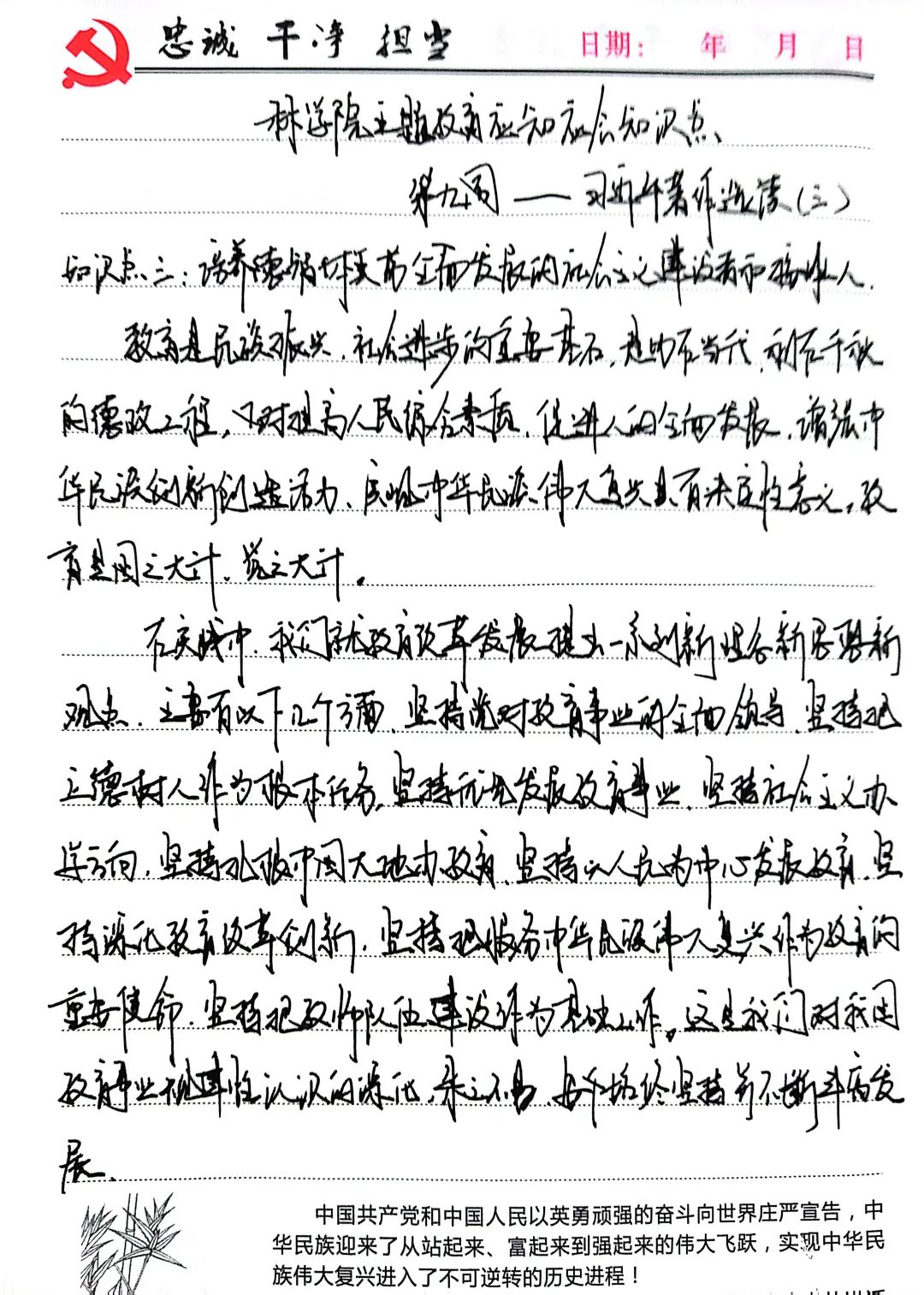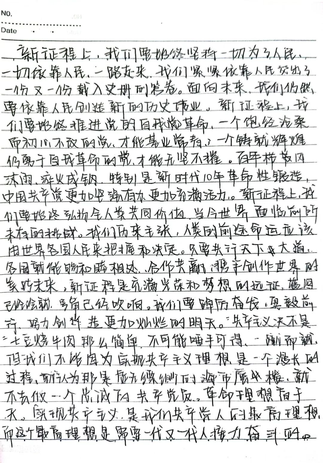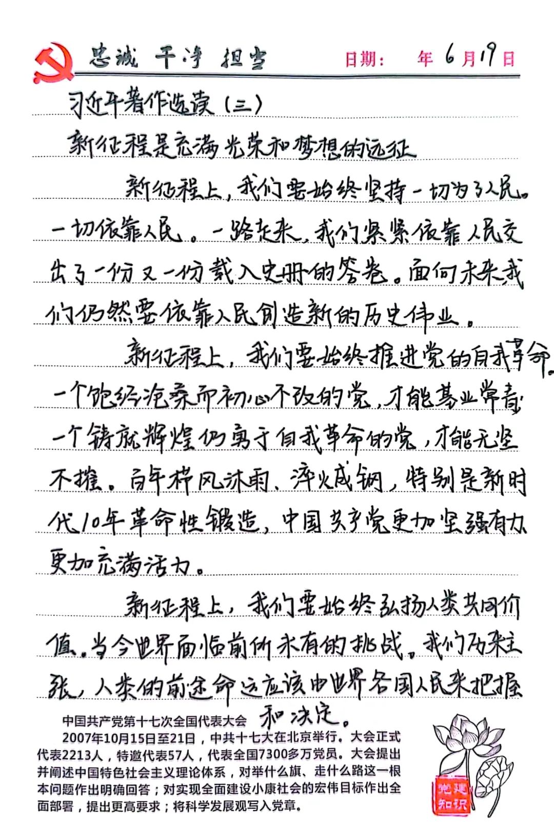 当下的中国正处于飞速发展的新时期。作为一名党员要始终坚持正确的政治方向,政治原则,政治道路,努力学习,主动提高思想觉悟,为祖国的富强民主文明和谐美丽贡献自己的力量。