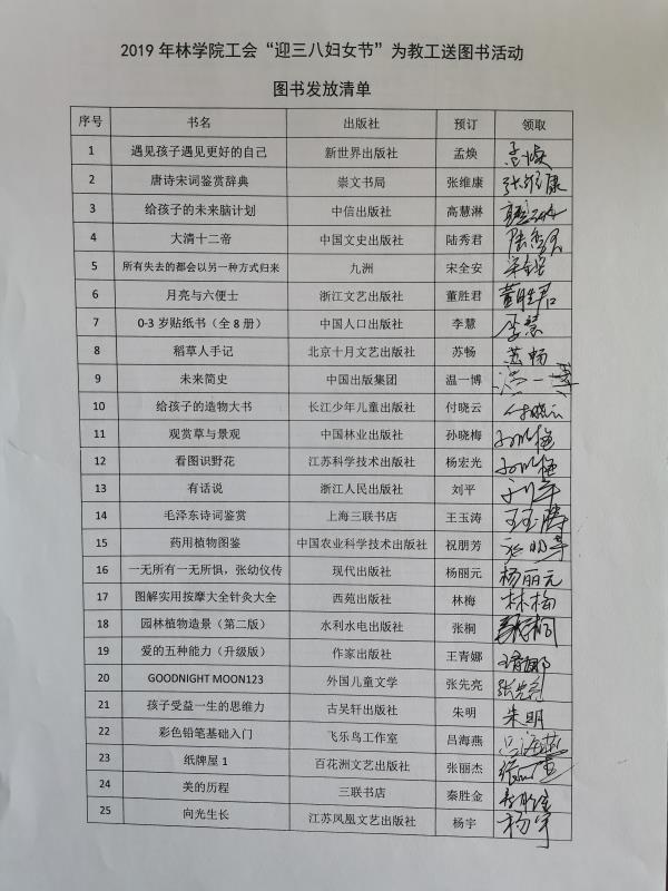 在“三八妇女节”来临之际,林学院工会组织学院女教工参加学校工会举办的各类保障和提升妇女权益的活动。同时,为响应国家提倡的读书学习活动,丰富工会会员的业余文化生活,林学院工会为林学院全体会员购买内容健康、趣味性和科学性强、品类丰富的现代和传统文化书籍。通过阅读,在读书中汲取营养,在学习中增长知识。此次赠书活动让职工体会到了工会组织对全体会员的关心,有利于更好地发挥会员的聪明才智,为建设强盛沈农贡献力量。