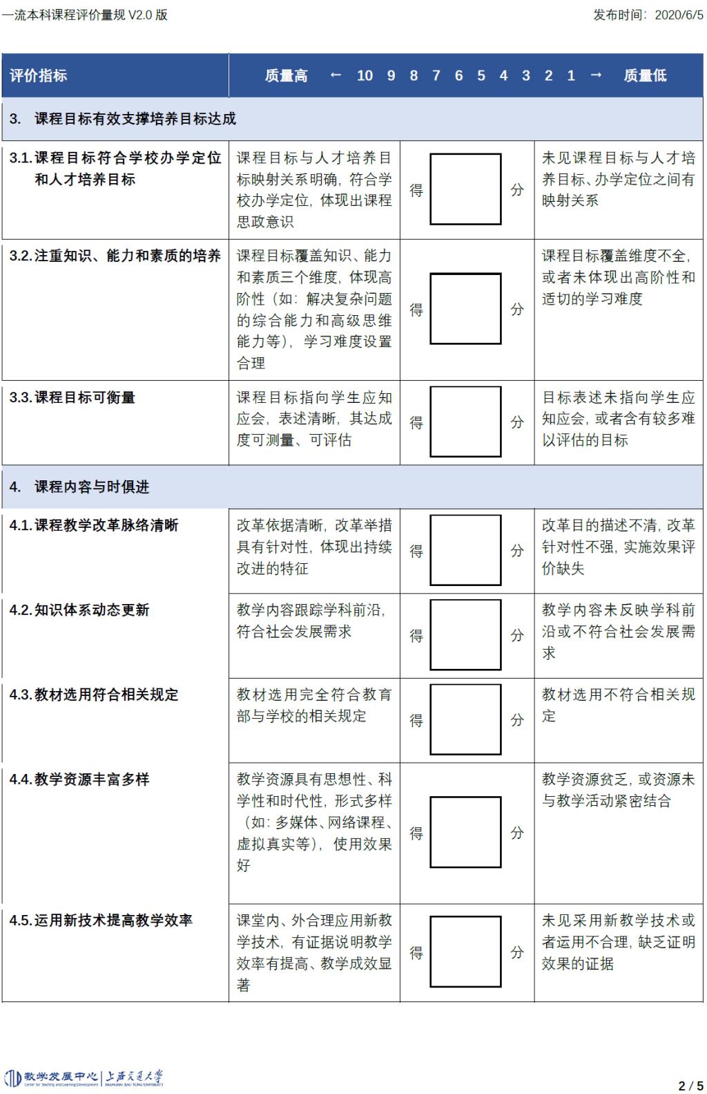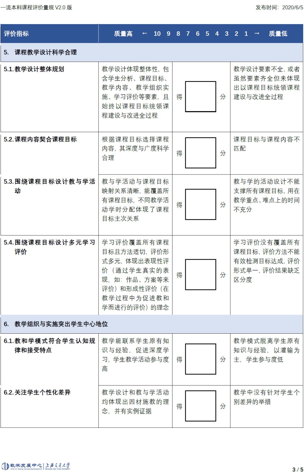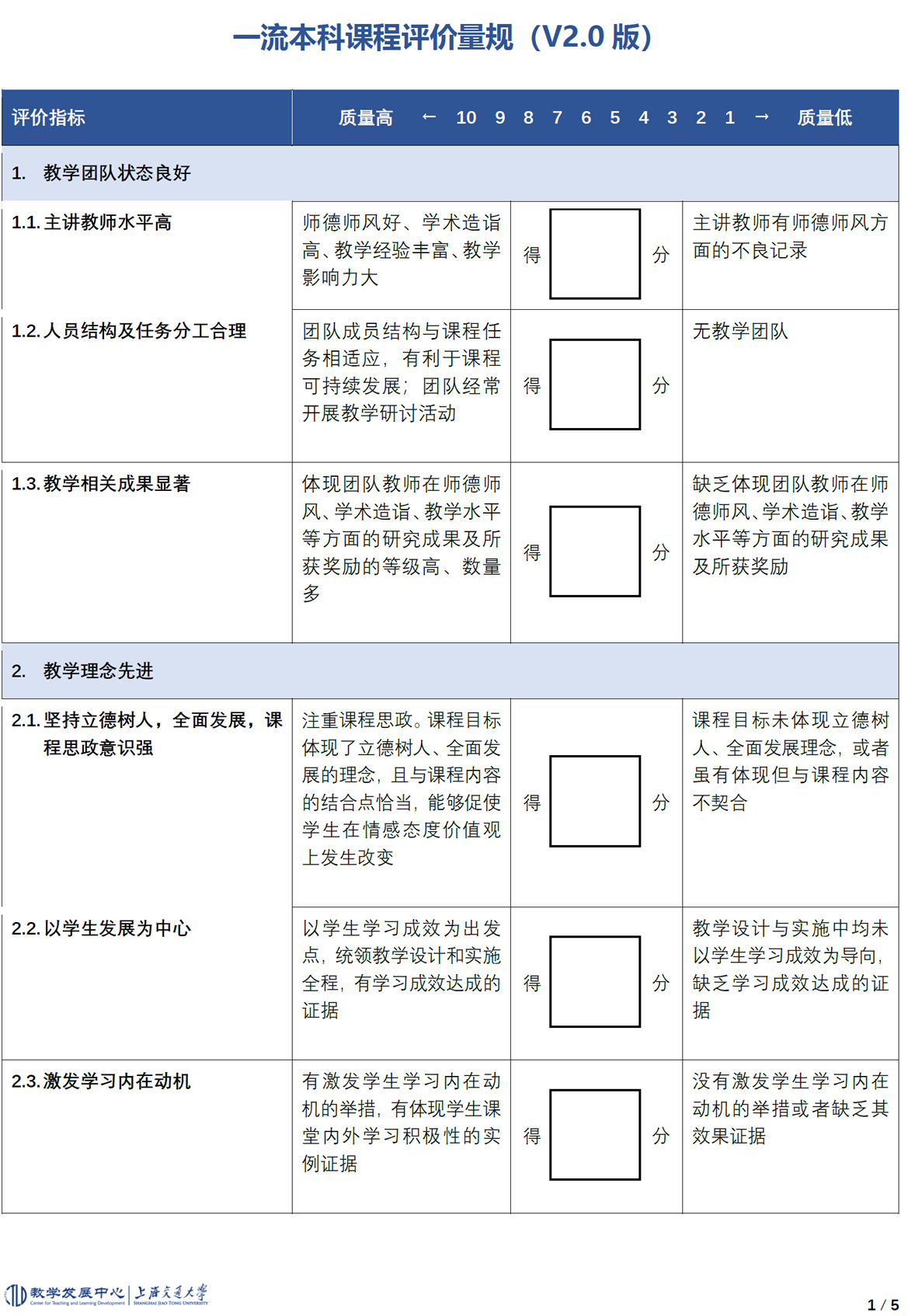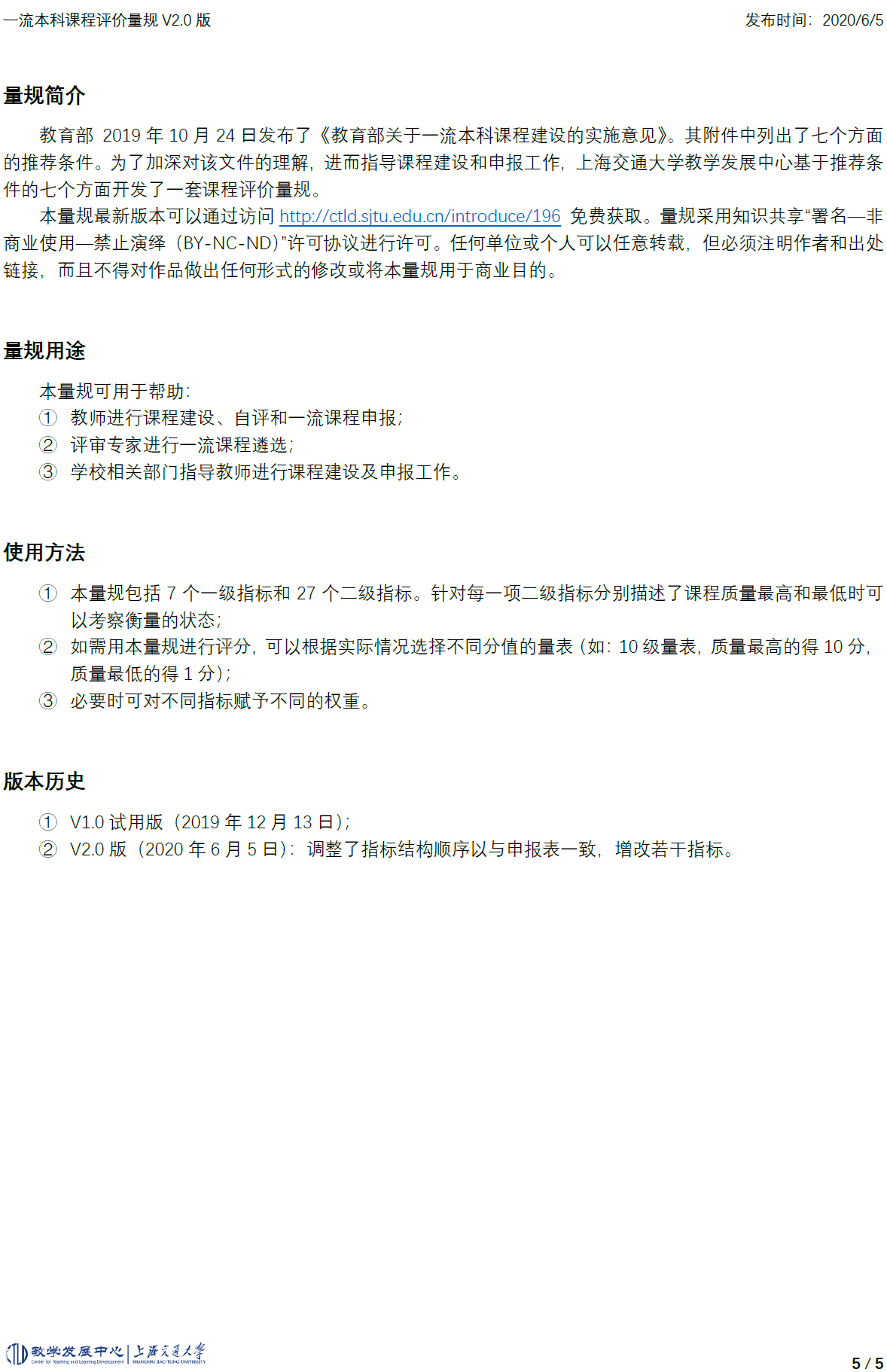 【量规简介】教育部 2019 年 10 月 24 日发布了《教育部关于一流本科课程建设的实施意见》。其附件中列出了七个方面的推荐条件。为了加深对该文件的理解,进而指导课程建设和申报工作,上海交通大学教学发展中心基于推荐条件的七个方面开发了一套课程评价量规。本量规最新版本可以通过访问 http://ctld.sjtu.edu.cn/introduce/196 免费获取。量规采用知识共享“署名—非商业使用—禁止演绎(BY-NC-ND)”许可协议进行许可。任何单位或个人可以任意转载,但必须注明作者和出处链接,而且不得对作品做出任何形式的修改或将本量规用于商业目的。